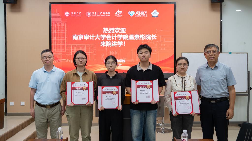 王雷介绍了“MPAcc会计名家公益大讲堂”的相关情况,表示该活动是由中国会计学会、全国会计专业学位研究生教育指导委员会共同发起的一项全国性公益活动,旨在充分发挥会计名家在引领和推动我国会计教育持续繁荣发展方面的重要作用,为MPAcc学员创造更多与会计知名学者交流和学习的机会,从而全面提升学员的综合素质。温素彬教授将本次讲座的全部课酬捐赠给AVxxx ,用于设立“MPAcc会计名家公益大讲堂奖学金”,以资助成绩优异的MPAcc学员顺利完成学业。根据入学成绩排名,2025级全日制MPAcc学员李蓓、李彤、苏清扬和张宇欣4位新生同学荣获该项奖学金。