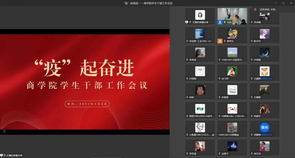 依托班主任队伍发挥育人导向作用,开展“‘疫’起奋进”云班会,引导学生专注课程学业,倡导配合疫情防控规定,疏导学生调适情绪想法,活动覆盖全体78个本硕班集体。国贸1902班主任戴越老师主持召开了以“学在江南守望相助、学习情况自省反馈、抗疫思政常记⼼间、良好生活从我做起、班级之星评选来袭”为主要内容的云上班会。他结合身边实例强调校园疫情防控的重要性与严肃性,引导同学们正确看待疫情防控与校园管理规定。会计1802班主任何家凤老师基于大四毕业生离校前的重要安排及时间轴,整理宣传了校园公众号发布的与同学们密切相关的“问题答疑”;此外,她对毕业年级学生的心理情绪尤为关心并建议大家:特殊时期不食外卖,调整作息,规律饮食;注重积极暗示作用,关注并及时调整心态;学会减压。金融2001班主任郭建伟老师在云班会伊始,隔空问候了班级暂缓返校同学,关心询问了当前校园封闭管理期间的困难与需求,并在班级防疫网格增设信息收集渠道,叮嘱同学们做好以下三点:“三件套”“五还要”,非必要不流动;填日报验两码,不恐慌不信谣;线上学不停步,守信念筑未来。