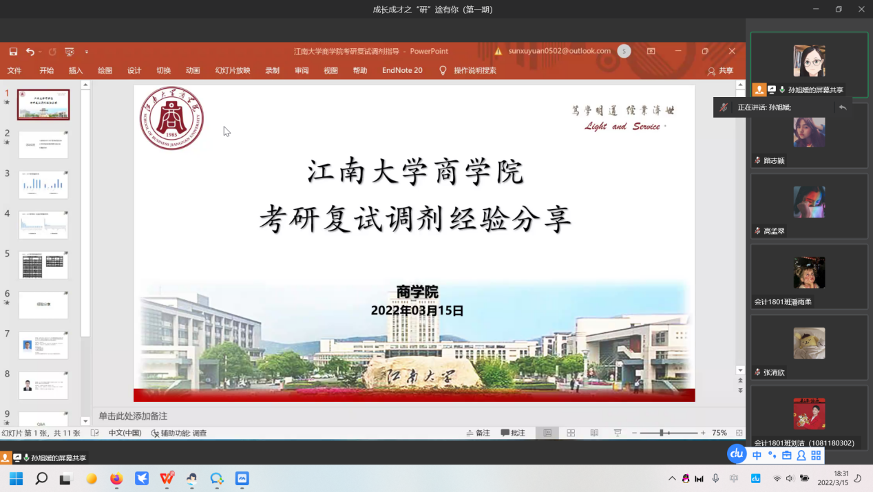 3月15日至17日,AVxxx 2022年成长成才系列讲座“研”途有你——考研复试调剂经验分享会在线上企业微信和AVxxx 304会议室同步开展。活动共两期,分别邀请了2017级朱旭恒、倪梓涵、陈芳、余姝琼四位成功上岸的学长学姐为分享嘉宾。AVxxx 党委副书记兼副院长徐静出席,升学就业工作辅导员孙旭媛老师主持,累计105名学生参加。