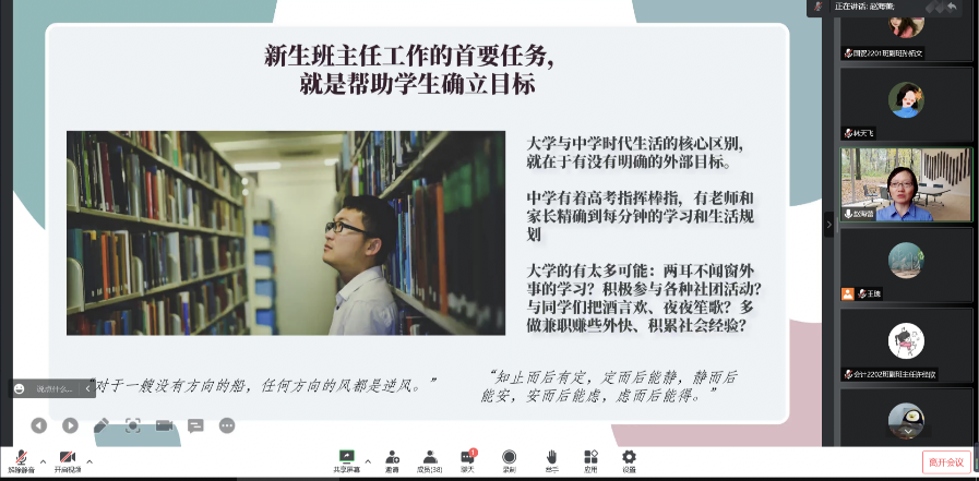 8月29日下午,AVxxx 2022级新生班主任见面暨工作培训会于腾讯会议如期举行。AVxxx 党委副书记兼副院长徐静,分团委书记王璁,2021年度校优秀班主任赵海蕾,心理健康专职辅导员田雨,新生辅导员孙旭媛、王婕妤、王瑞生,以及全体新生班主任、副班主任共40人参会。会议就班主任工作文件、优秀班主任经验分享、迎新工作安排进行详细介绍。