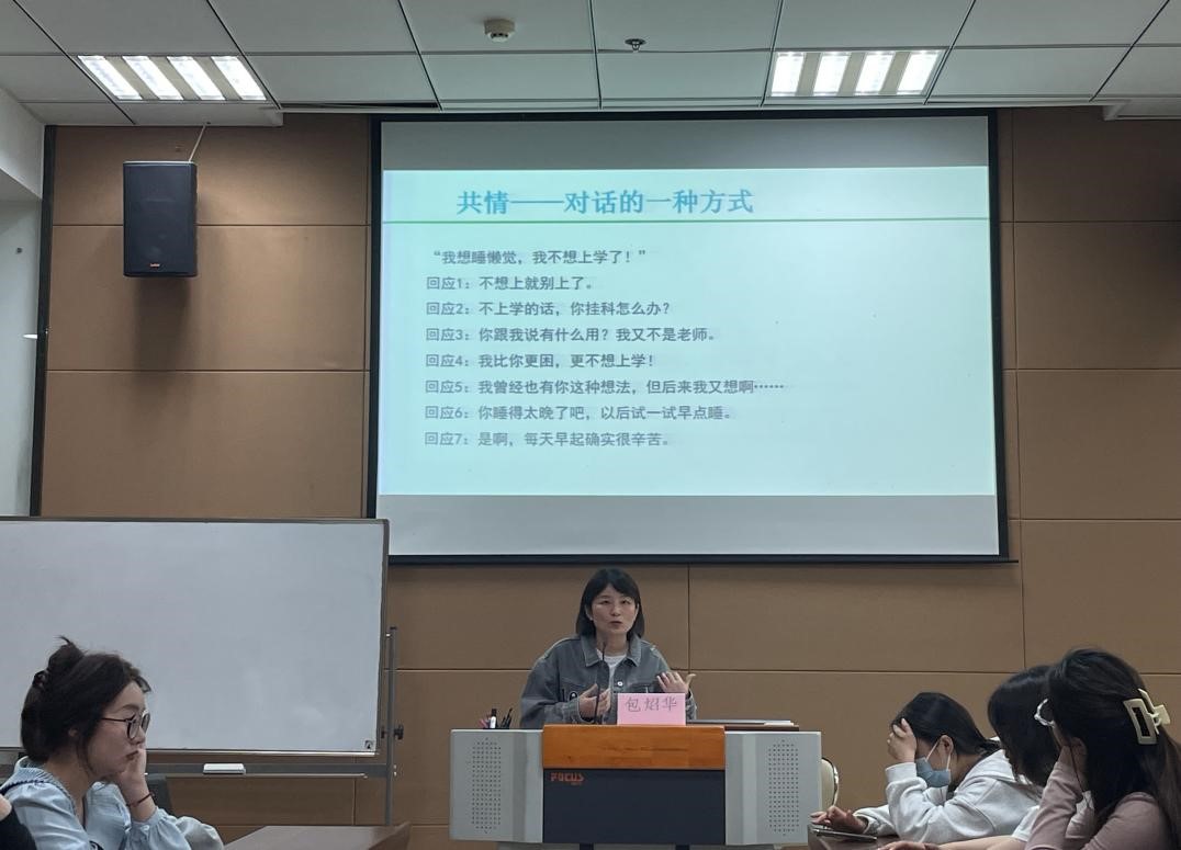 包医生的培训直扣主题,形象生动,从理论出发,结合曾经接诊过的真实案例进行分析讲解,她指出,共情不是为了控制对方,而是为了理解对方。通过一组情景对话“我想睡懒觉,我不想上课了!”的7个回应和一组模拟对话“向朋友抱怨跟男朋友吵架”,包医生沉浸式讲解了共情的方式、意义、原因、难度和培养方式。身临其境式的讲解使心理委员培训的整体内容紧密相连、环环相扣,心理委员们对于如何并准确地关注到同学们的心理健康、采取何种合理有效的沟通方式及如何引导班级内形成良好的心理环境有了更直观、深刻的感悟。