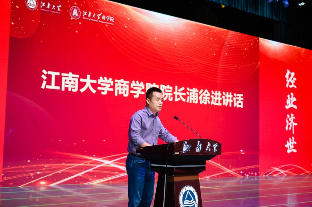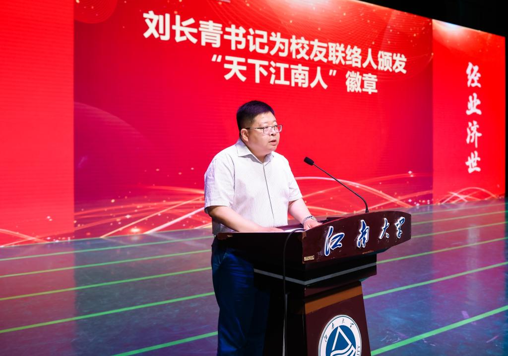 党委书记刘长青带领毕业生佩戴“天下江南人”徽章并讲话