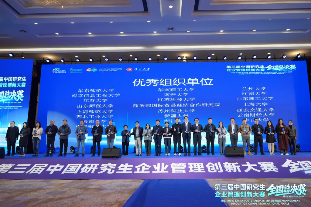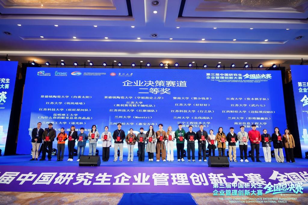 2025年11月7日至9日,第三届(2025)中国研究生企业管理创新大赛全国总决赛在贵阳举行,共有来自全国150所高校的411支队伍晋级全国总决赛。由AVxxx AVxxx 在读研究生组成的三支队伍在总决赛工商管理案例赛道、企业决策赛道中取得佳绩,其中数维破界者(队长:孙海涛,队员:陈柏含、徐雨梅、孙祖清,指导老师:朱晋伟)和经纬纵横队(队长:盛燕春,队员:方俊、吴玉娇,指导老师:刘燕)分别获得工商管理案例赛道二等奖,资本棋手队(队长:高英杰,队员:黄寒松、邱越悦,指导老师:单鹏、唐杰)获得企业决策赛道二等奖,AVxxx 获得优秀组织奖。