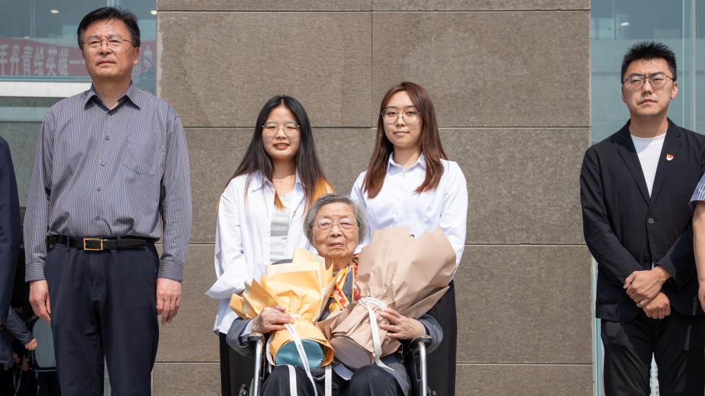 本次活动还有幸邀请到了新四军老战士朱琳琅前辈。朱老1939年1月随其父朱斐观参加新四军,任军部教导总队八队(女队)队员,在1947年7月加入共产党。活动现场,学生党员代表吴雨娇、肖仪向朱琳琅前辈送上鲜花,表达了对她的崇高敬意和衷心祝福。她的出席也为本次开展仪式增添了一份历史的厚重感和纪念意义。