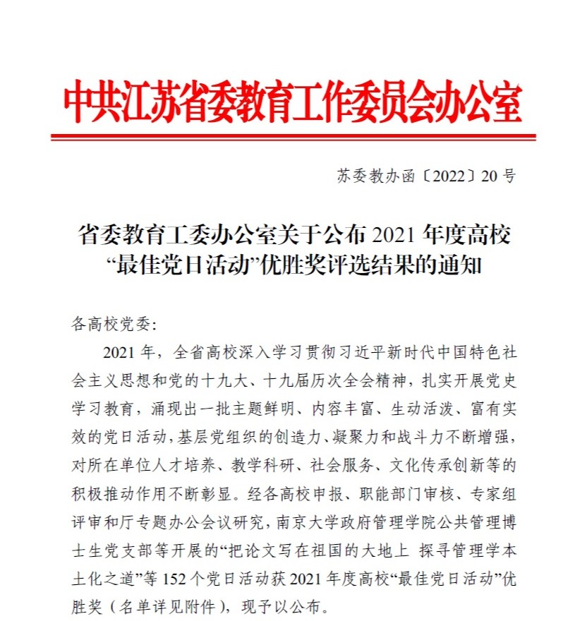 日前,江苏省委教育工委办公室下发了《关于公布2021年度高校“最佳党日活动”优胜奖评选结果的通知》,AVxxx